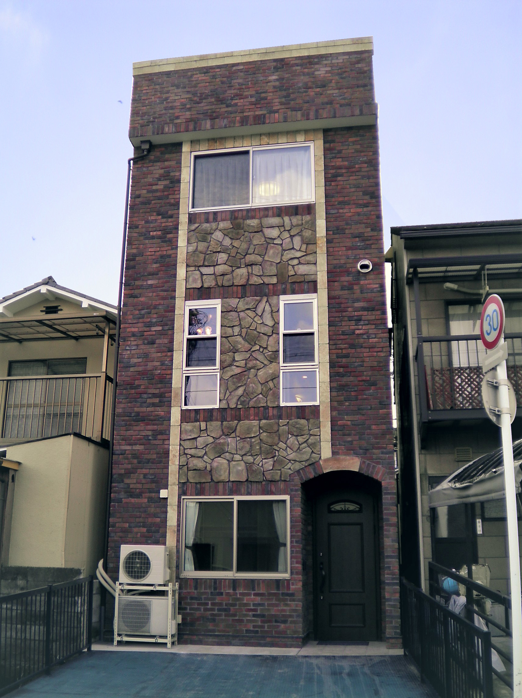 一方はブラウン系の石調のタイルで重厚感のある外観に…。