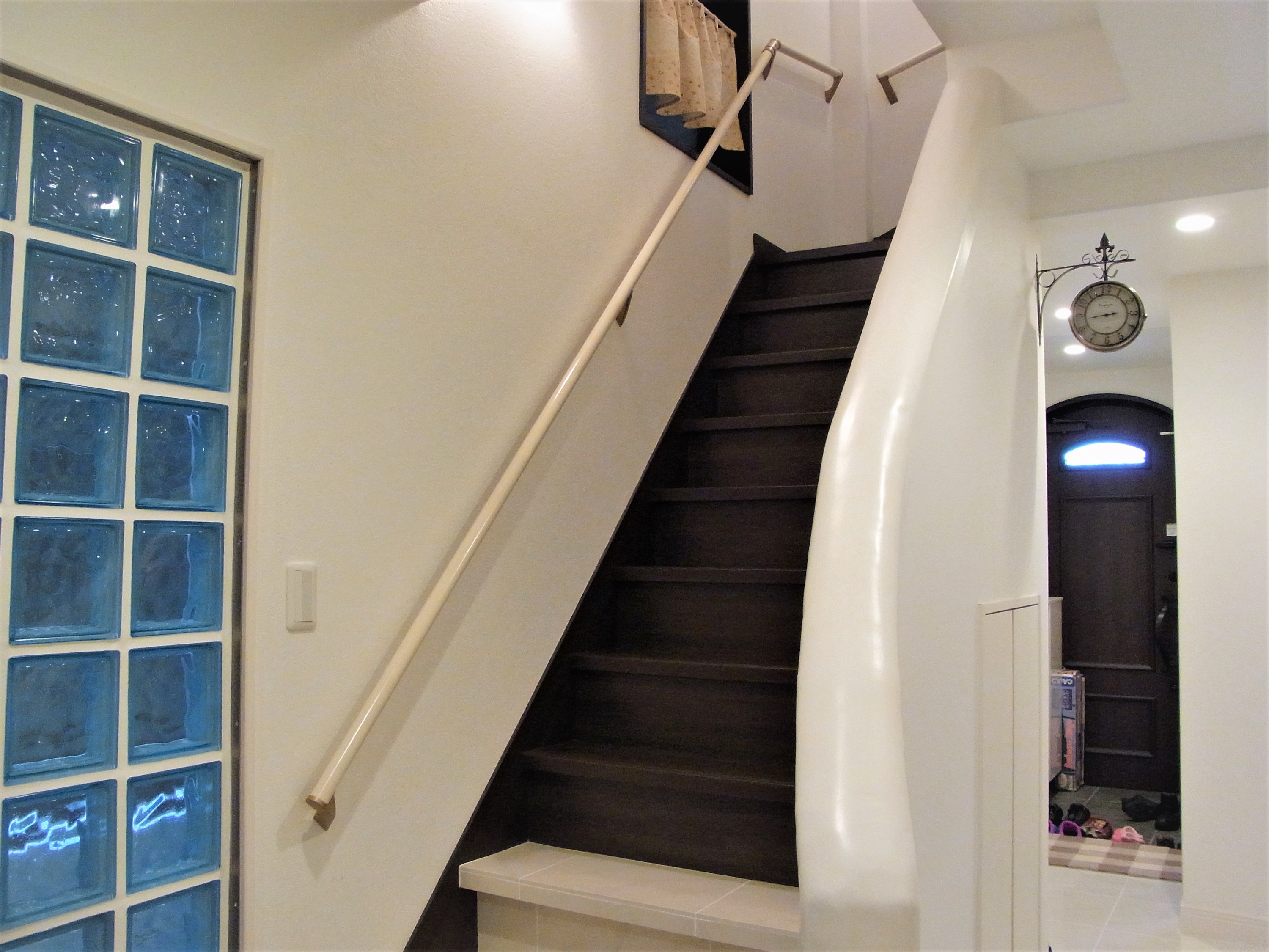 また、1階の床はタイル張りとなっており、階段手すりは左官と塗装で仕上げて、店舗のようなデザインにしています。