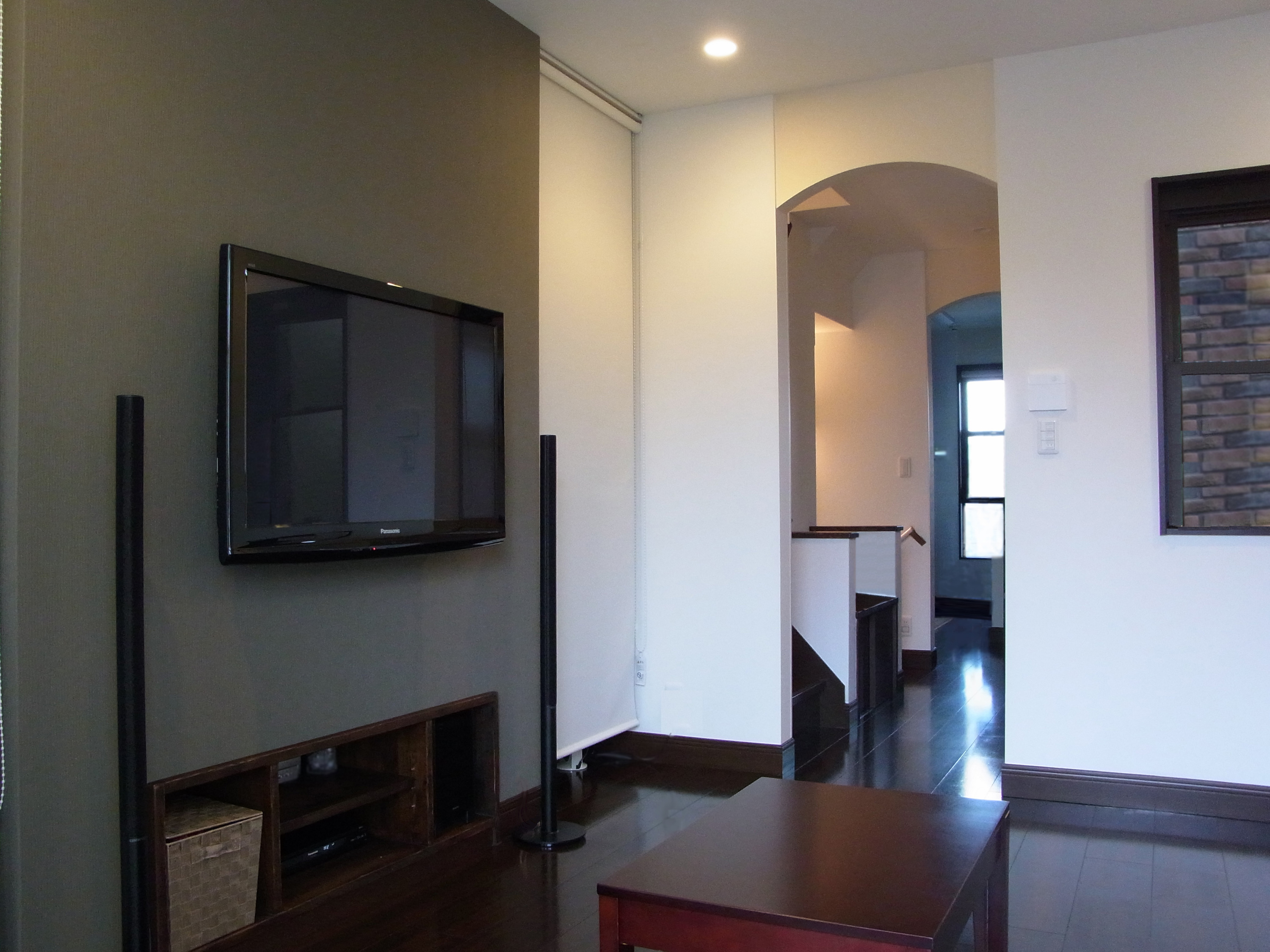 リビングには壁掛けテレビを取り付ける壁があり、その壁の後ろに収納スペースをたっぷり設け、約14坪の建坪でも落ち着きのあるリビングとなっています。