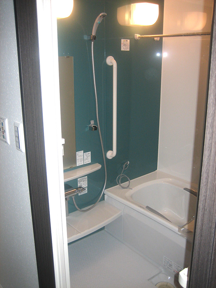お風呂も両サイドの壁と天井を白、奥を緑の壁にすることで狭いながらも圧迫感なしの奥行きを感じられるようにしています。