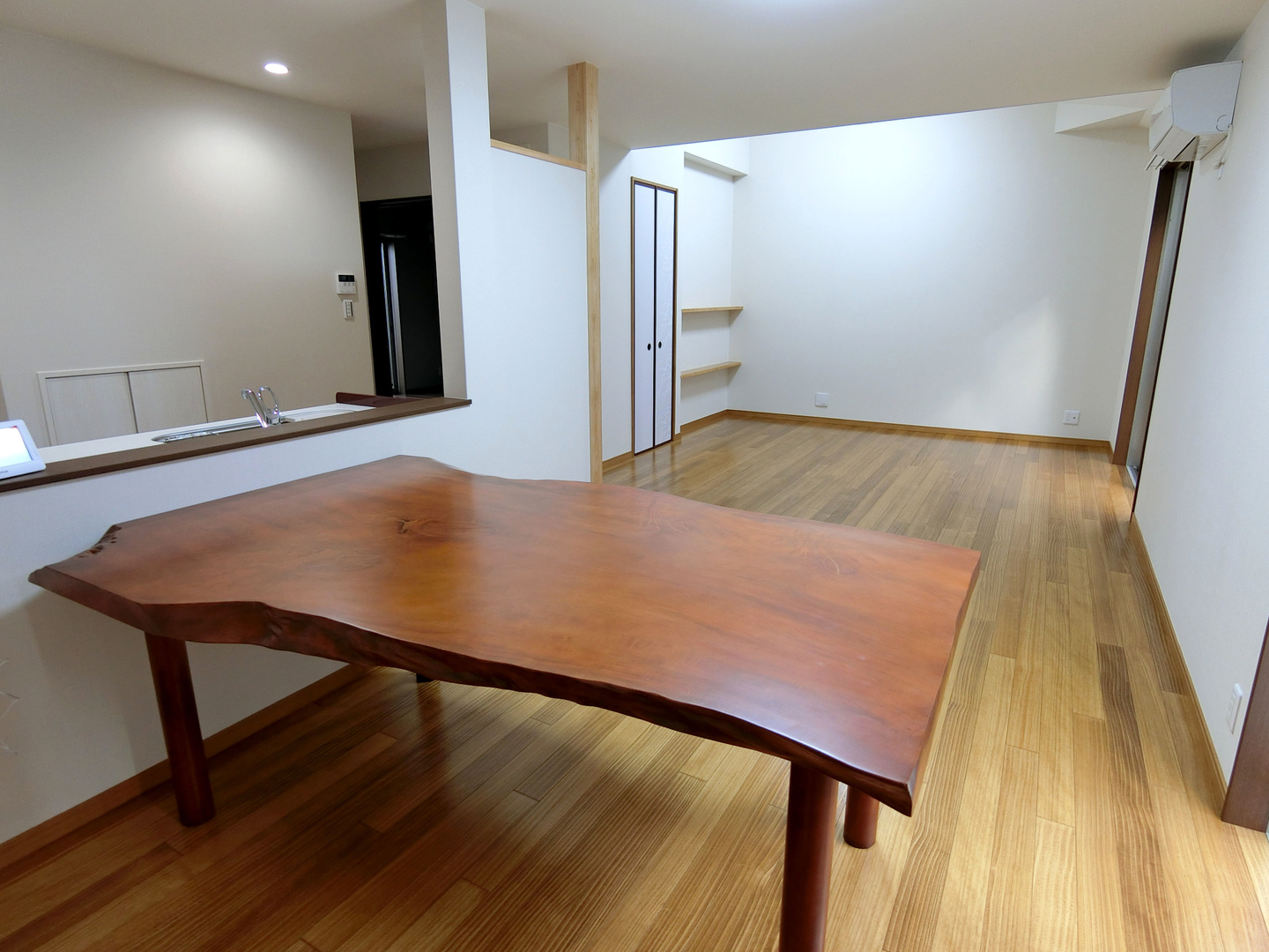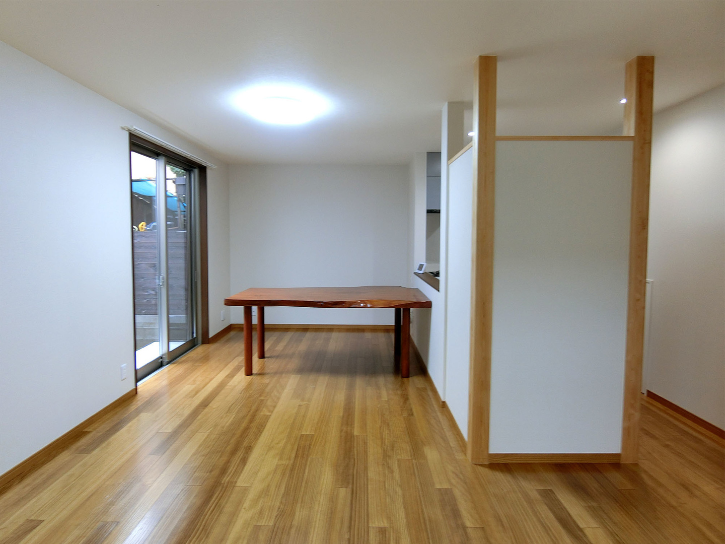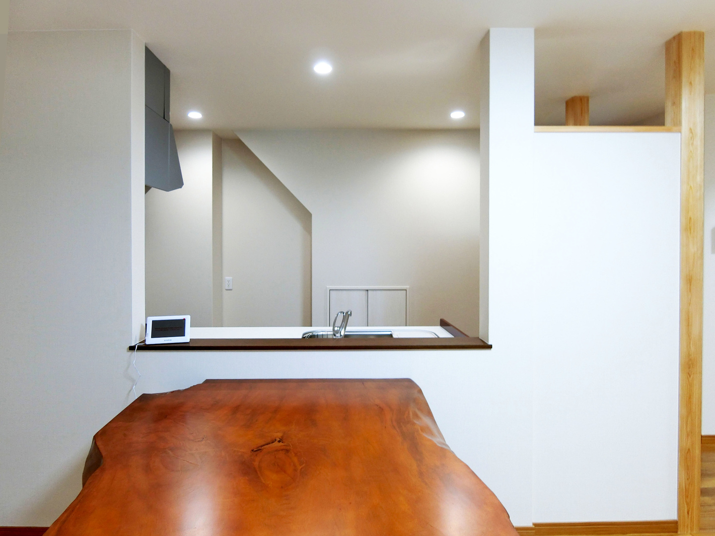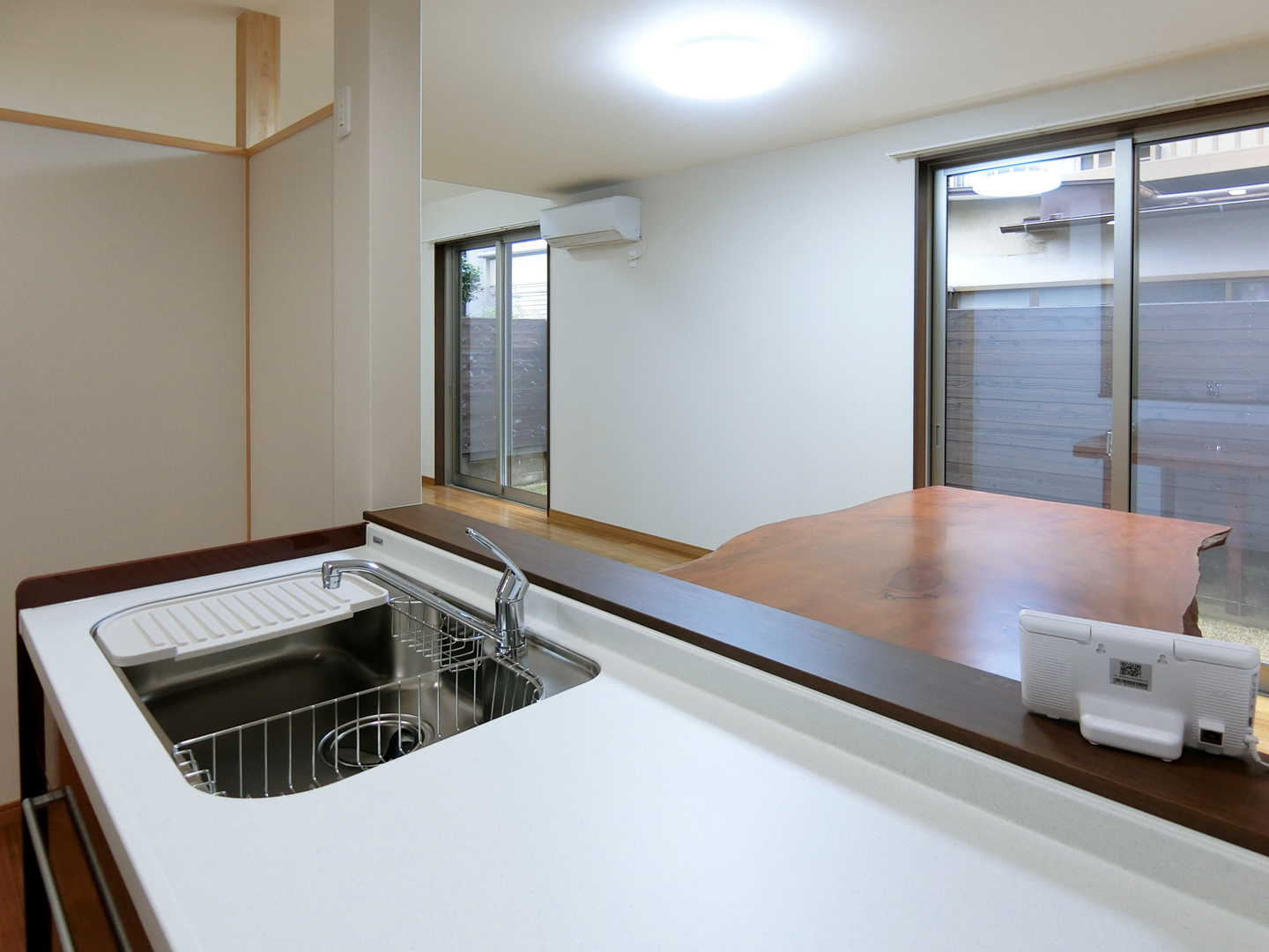 一部を1階建てとしたことで、リビングダイニングの一部は高い天井になっており、開放感があります。庭の緑と合わさると空間がさらに広く感じられるように工夫されています。また、家族の集まるリビングダイニングには無垢フローリングを採用しました。ダイニングキッチンのポイントとなるヒノキの柱とも相性が良く、一枚板のダイニングテーブルにもピッタリと合います。