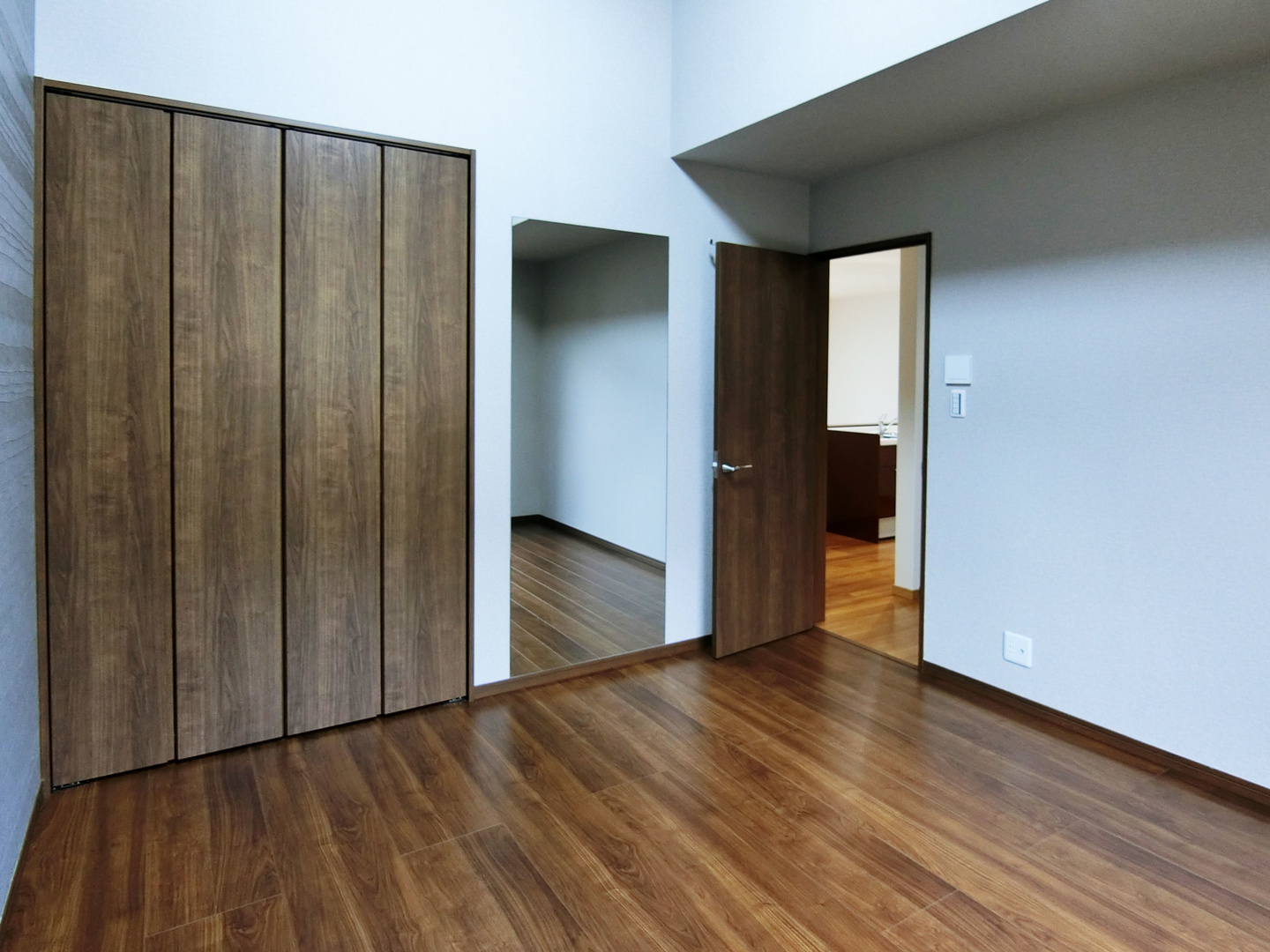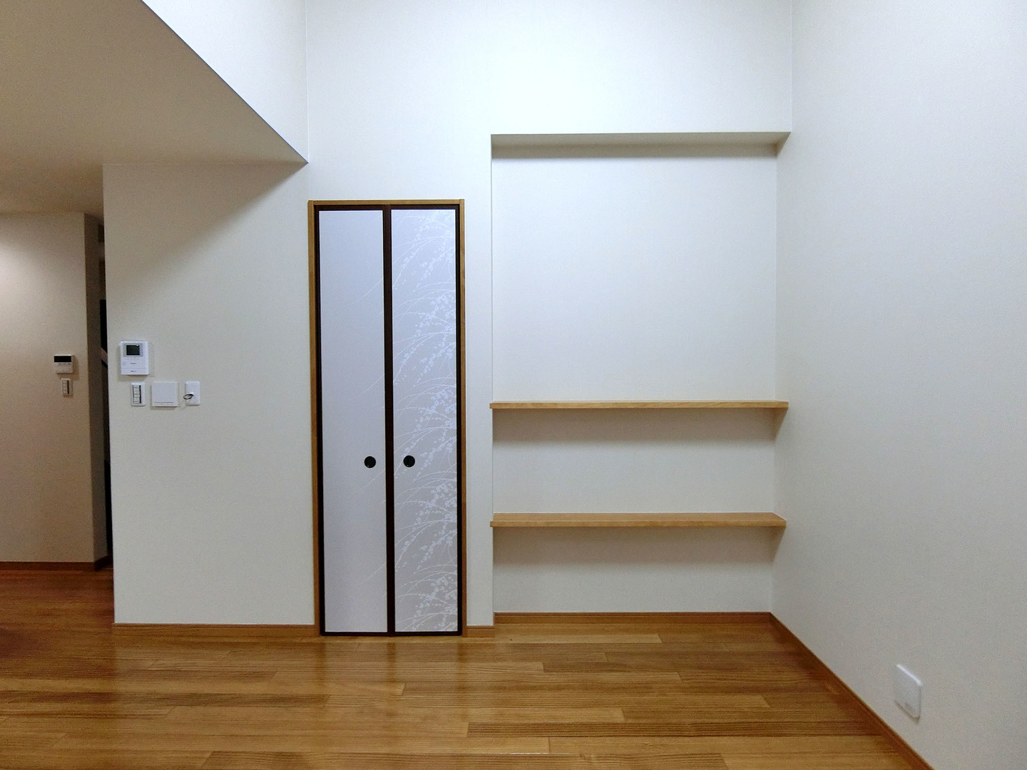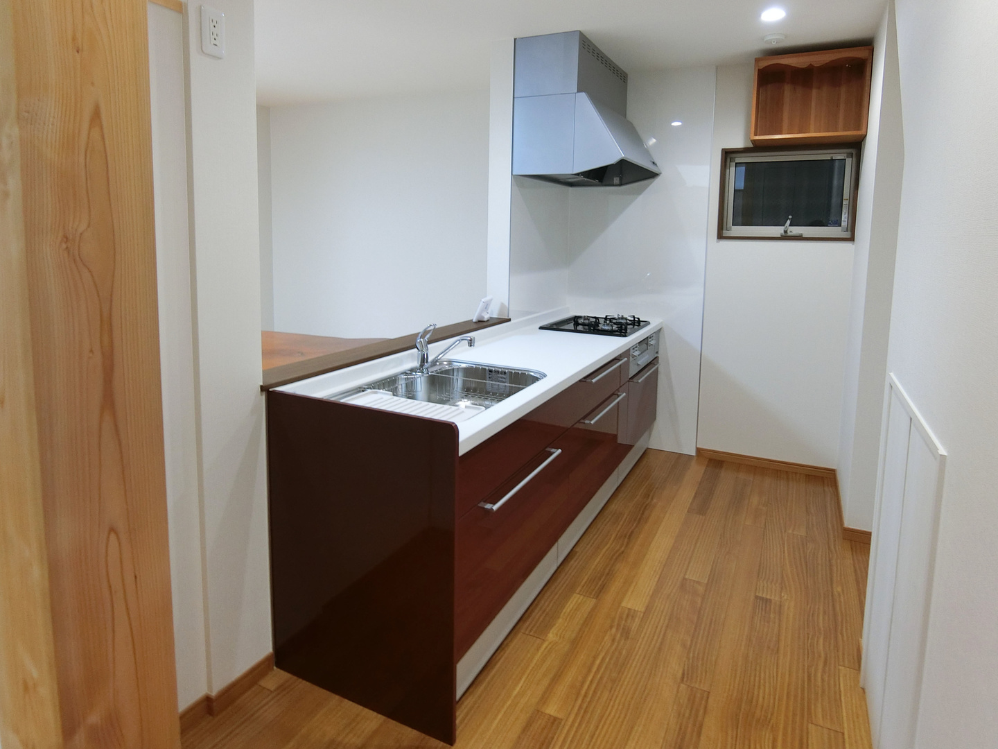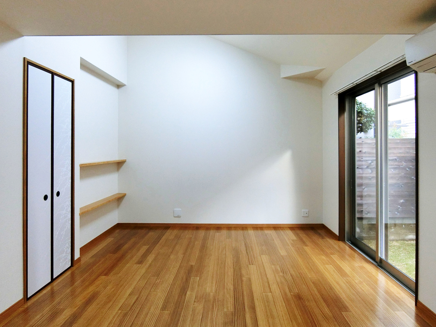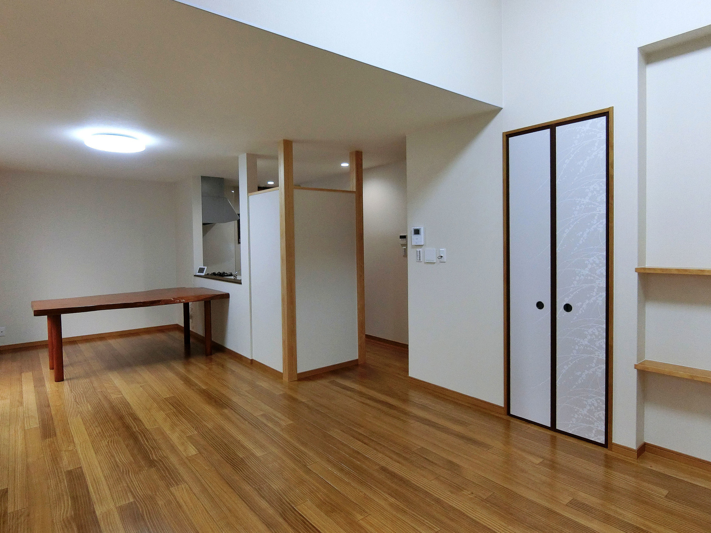 一部を1階建てとしたことで、リビングダイニングの一部は高い天井になっており、開放感があります。庭の緑と合わさると空間がさらに広く感じられるように工夫されています。また、家族の集まるリビングダイニングには無垢フローリングを採用しました。ダイニングキッチンのポイントとなるヒノキの柱とも相性が良く、一枚板のダイニングテーブルにもピッタリと合います。