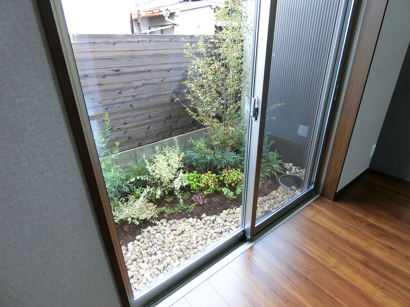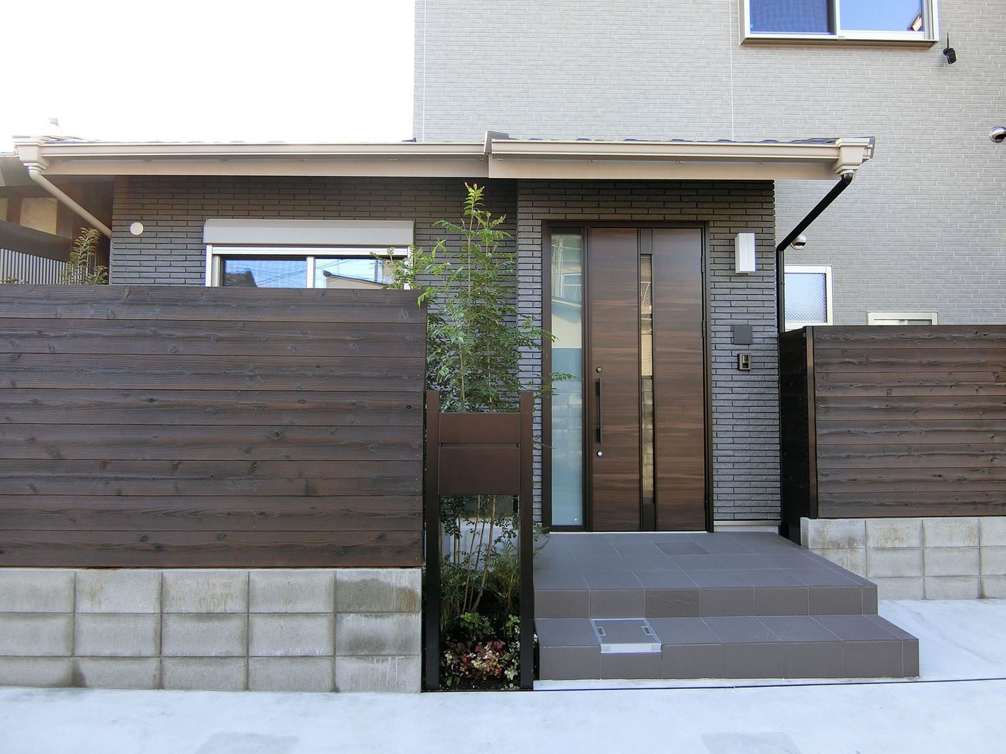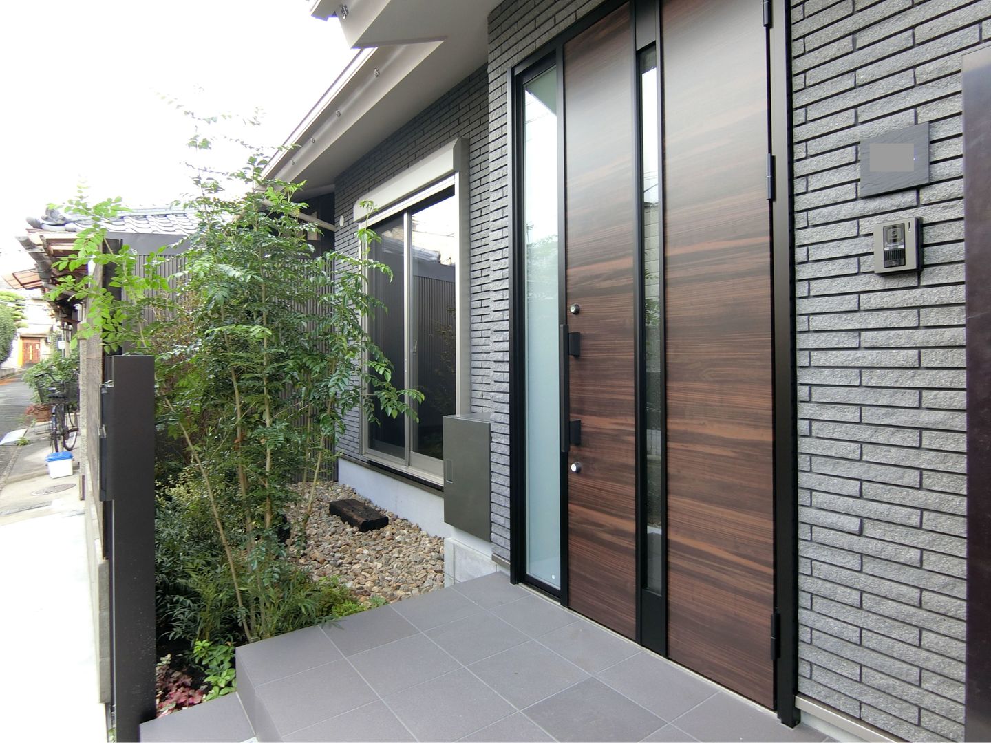 外壁の1階部分にはタイルを貼りました。2階部分はサイデイングとしましたが、ともに馴染み、庭の緑と塀の焼き板とあわさって落ち着いた良い雰囲気のイエとなりました。庭は2つあり、リビング側には広々とした芝生の庭。また観賞用の庭が表からも見えるようになっています。