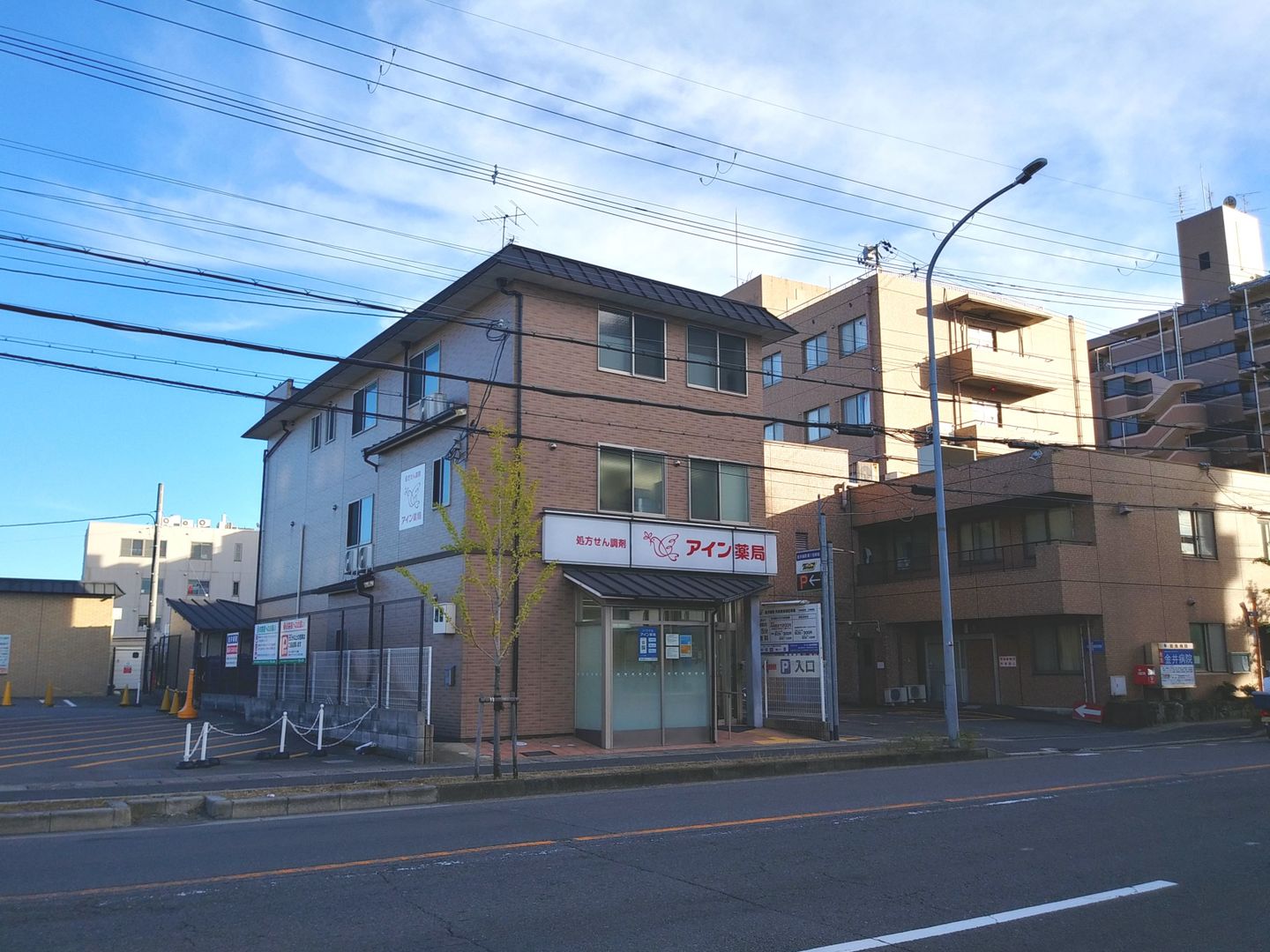 伏見区8号線沿いにあるアイン薬局。隣に建つ病院と調和した外観としています。