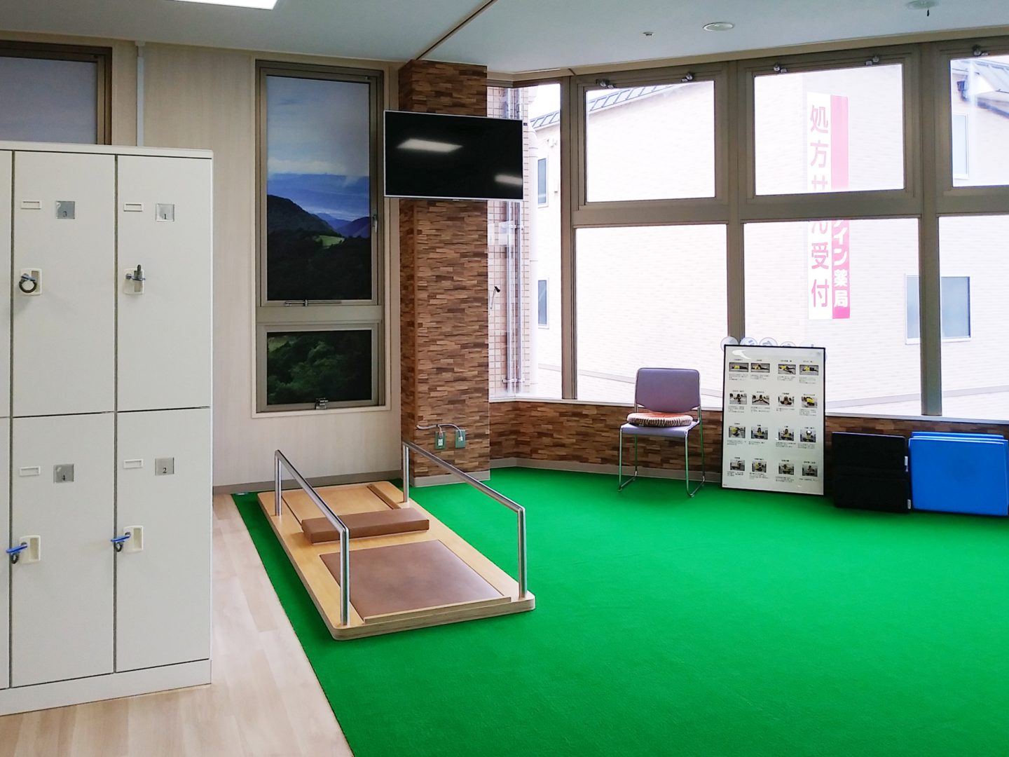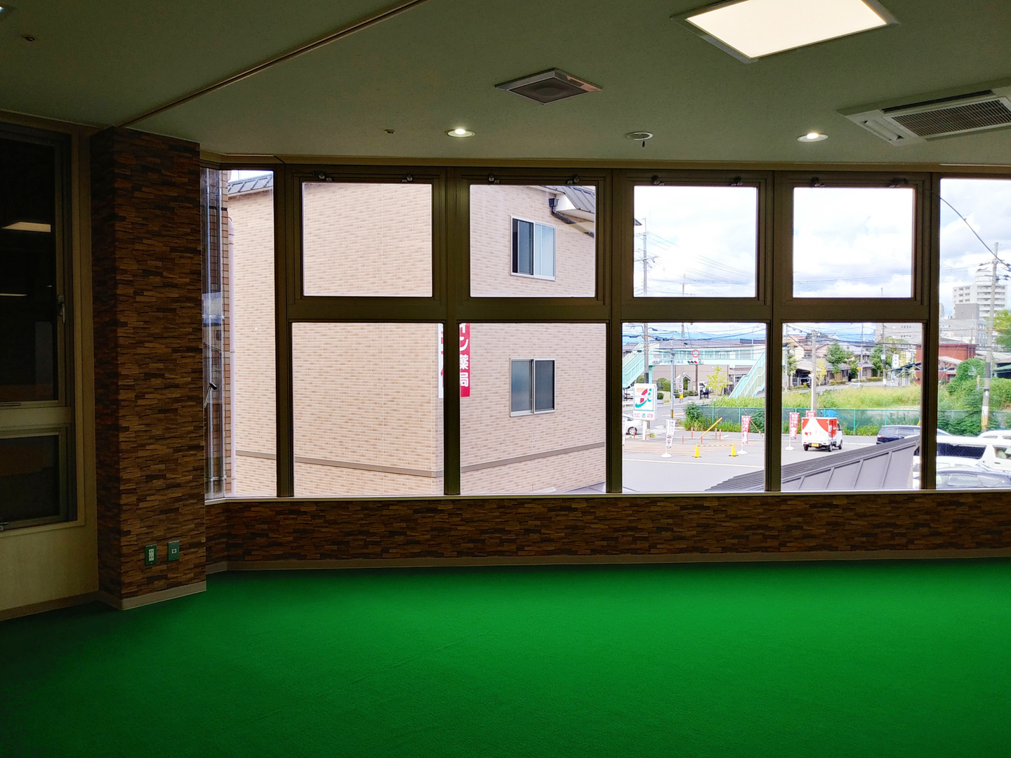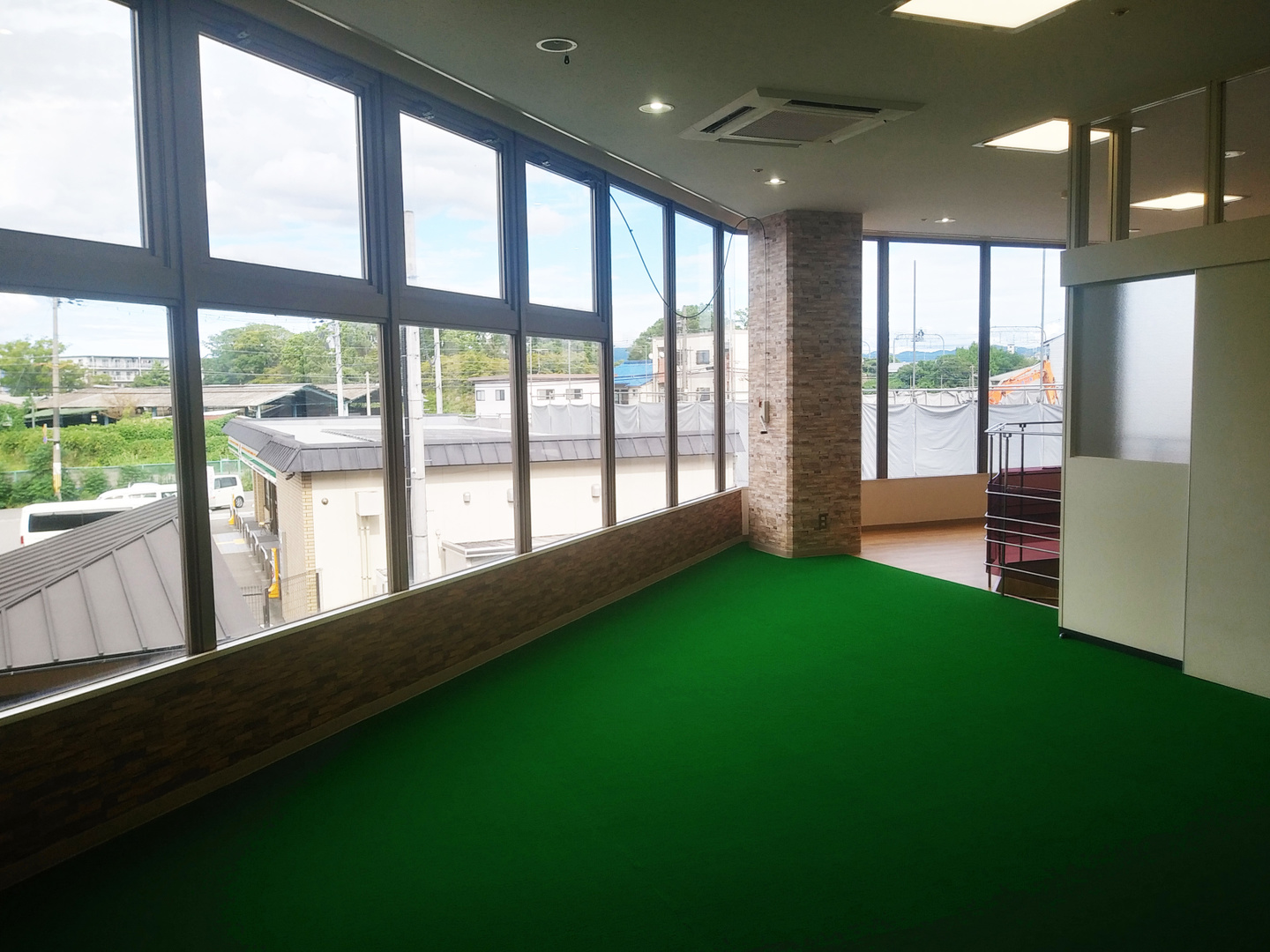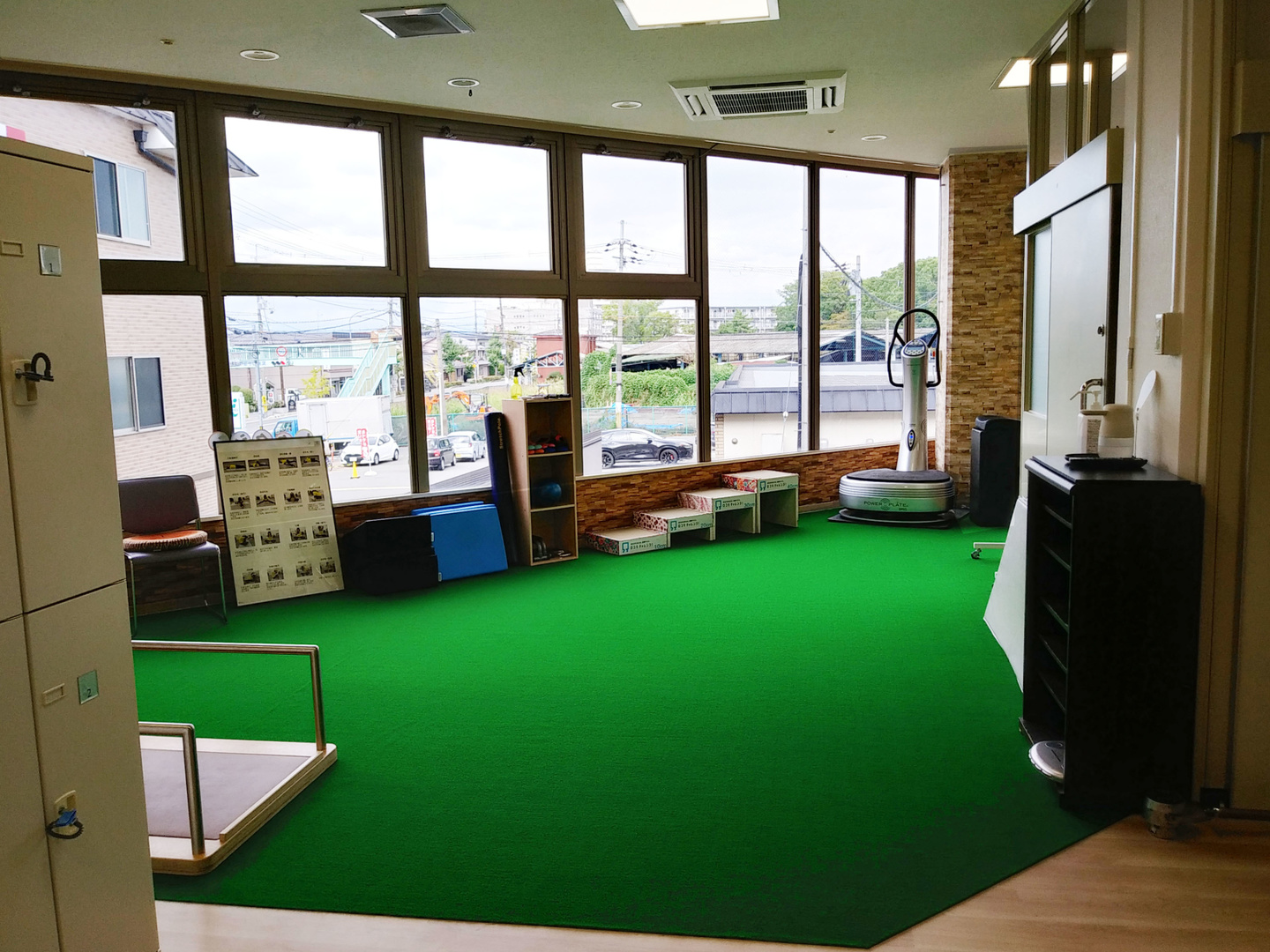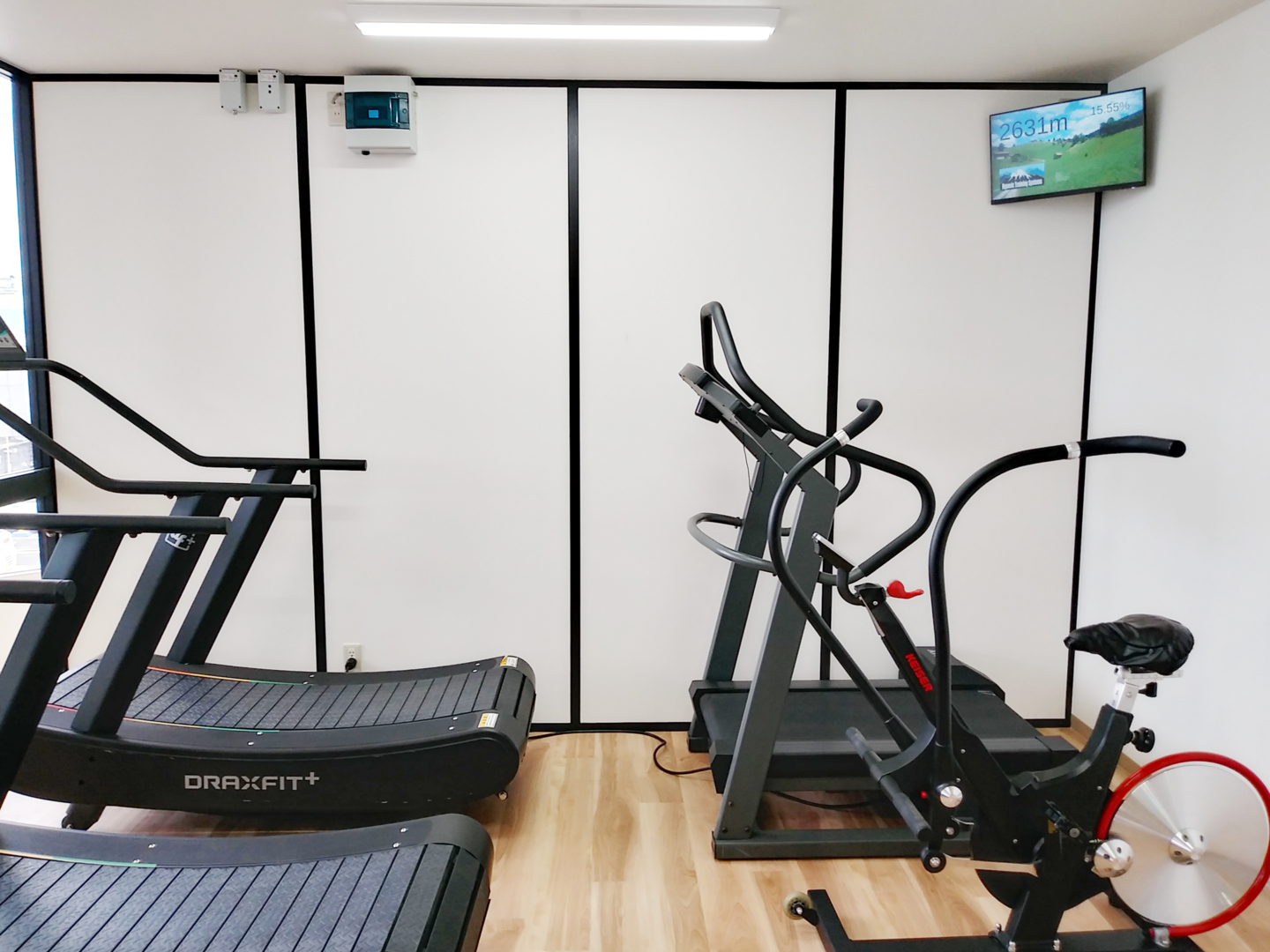 ガラス貼りの明るい2階を改修工事して、メディカルフィットネスにリフォームしました。運動前にストレッチが行える人工芝のゾーンをはじめ、フィットネス用床材を貼ったトレーニングマシーンコーナー!そして、酸素の薄い標高2500mの高地環境を実現する低酸素ボックスを設置工事しました。利用ゾーンの壁と床を全て綺麗にリフォームしてオープン!
