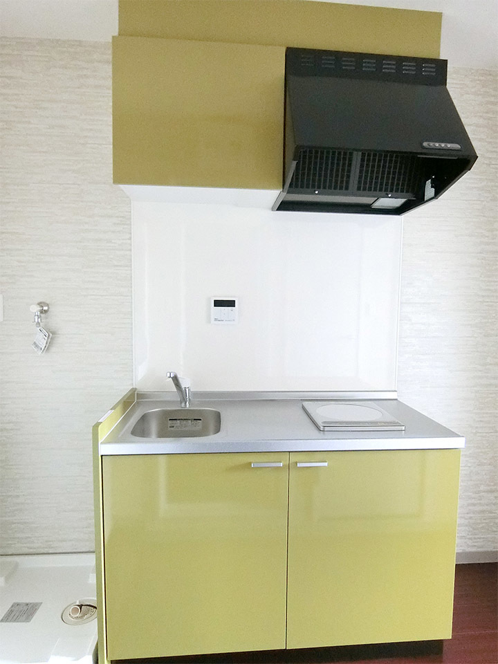 かっこいいネイビーとお洒落な黄緑色のお部屋があり、料理が楽しくなるキッチンです。